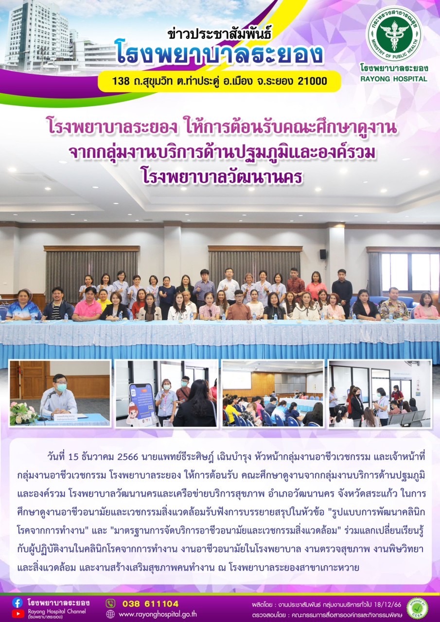 15 ธันวาคม 2566 ต้อนรับคณะศึกษาดูงานจากกลุ่มงานบริการด้านปฐมภูมิและองค์รวม โรงพยาบาลวัฒนานคร จ.สระแก้ว