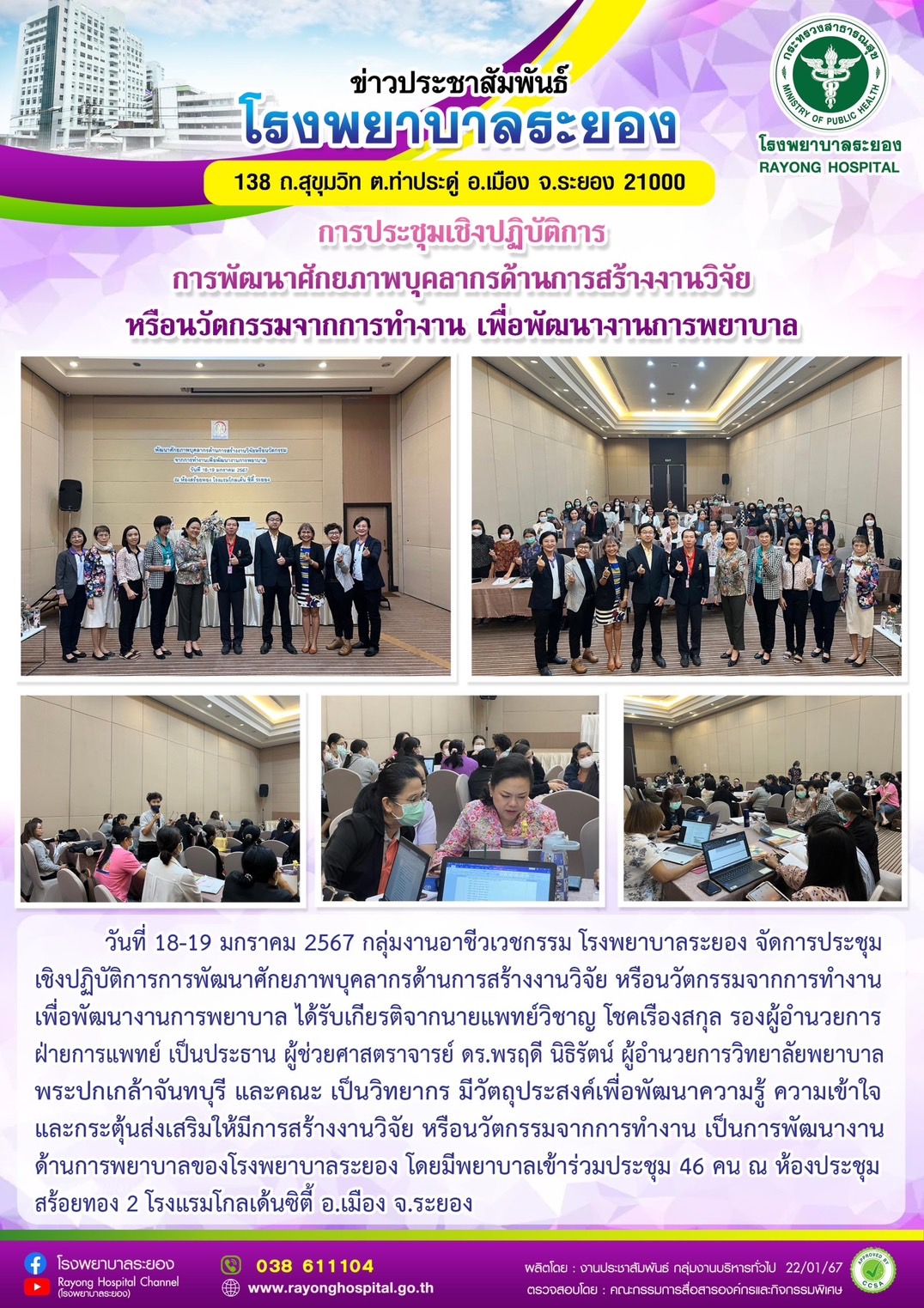 18-19 มกราคม 2567 จัดประชุมเชิงปฏิบัติการการพัฒนาศักยภาพบุคลากรด้านการสร้างงานวิจัยหรือนวัตกรรมจากการทำงาน เพื่อพัฒนางานการพยาบาล