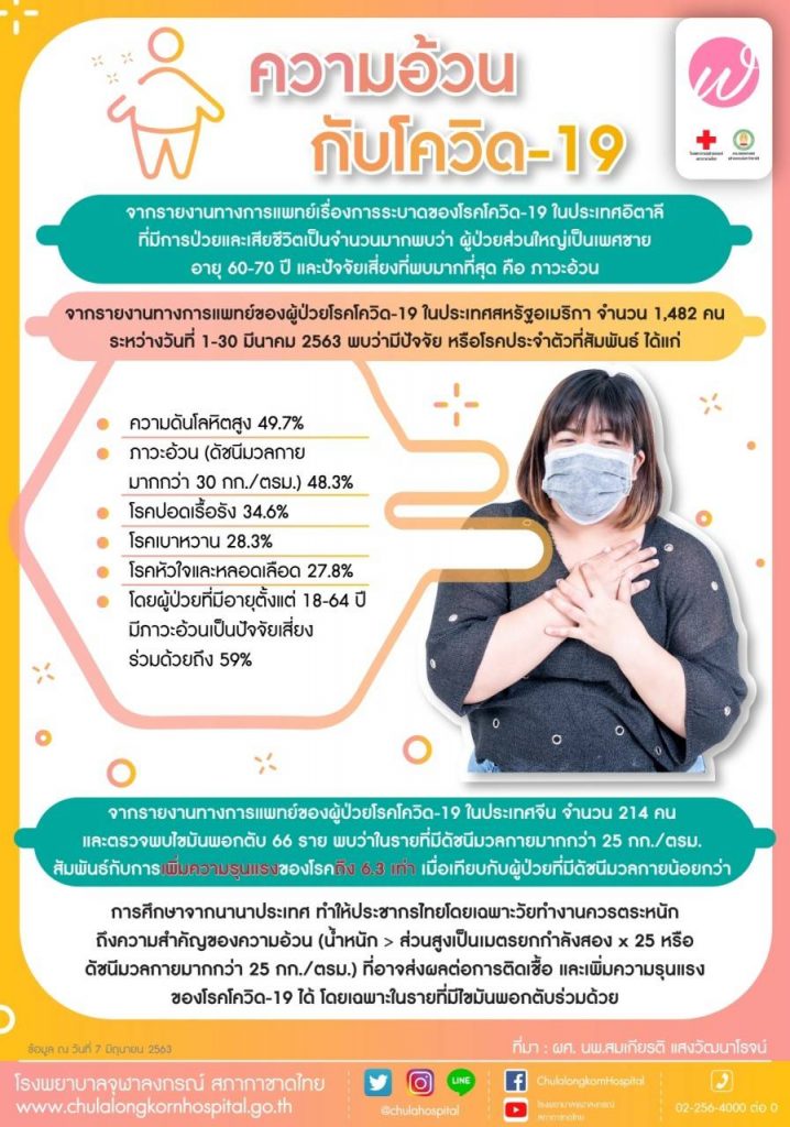 ที่มา : ผศ.นพ.สมเกียรติ แสงวัฒนาโรจน์ (2020). ความอ้วนโควิด-19. สืบค้น 17 พย.64, ความเสี่ยงคนอ้วนกับโควิด-19 – จุฬาลงกรณ์มหาวิทยาลัย (chula.ac.th)
