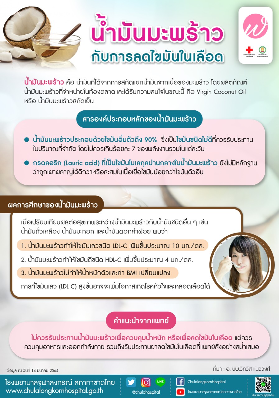 ที่มา: อ.นพ.วิทวัส แนววงศ์ (2021).น้ำมันมะพร้าวกับการลดไขมันในเลือด.สืบค้น 23 พย.2564,น้ำมันมะพร้าวกับการลดไขมันในเลือด - โรงพยาบาลจุฬาลงกรณ์ สภากาชาดไทย (chulalongkornhospital.go.th)