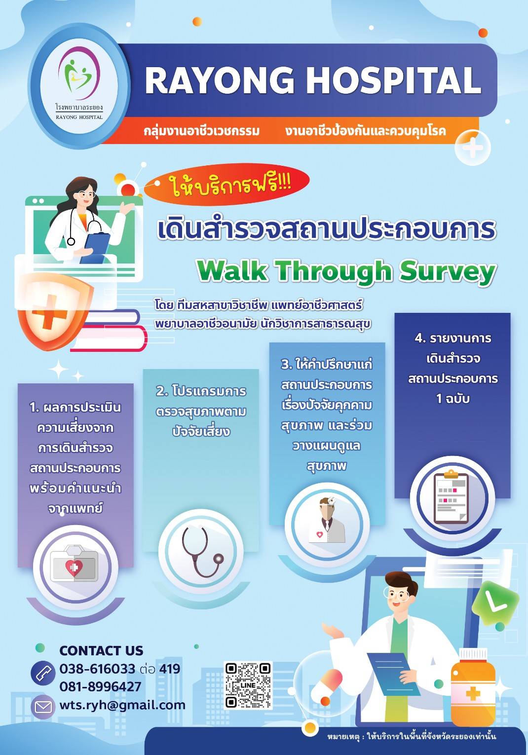 กลุ่มงานอาชีวเวชกรรม งานอาชีวป้องกันและควบคุมโรค ให้บริการฟรี เดินสำรวจสถานประกอบการ Walk Through Survey โดยทีมสหสาขาวิชาชีพ แพทย์อาชีวเวชศาสตร์ พยาบาลอาชีวอนามัย และนักวิชาการสาธารณสุข ติดต่อสอบถาม โทร 038-616033 ต่อ 419 หรือโทร 081-8996427
