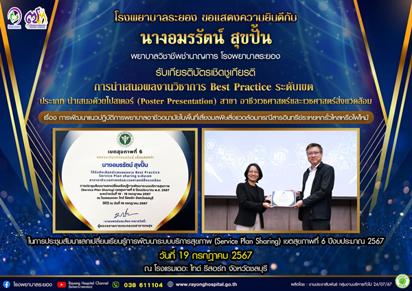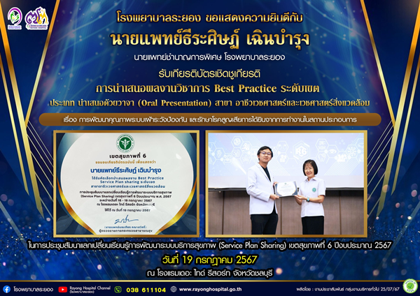 18-19 ก.ค. 67 ทีมอาชีวอนามัย รพ.ระยอง ได้รับคัดเลือกให้นำเสนอผลงานและบุคคลดีเด่น Service Plan สาขาอาชีวเวชศาสตร์และสิ่งแวดล้อม ในการประชุม Service Plan sharing Region 6,2024
