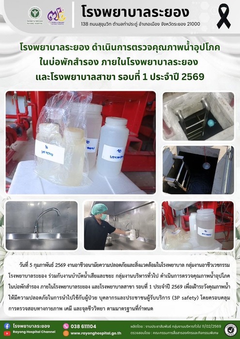 5 ก.พ. 69 งานอาชีวอนามัย ความปลอดภัยและสิ่งแวดล้อมในโรงพยาบาล กลุ่มงานอาชีวเวชกรรม โรงพยาบาลระยอง ร่วมกับงานบำบัดน้ำเสียและขยะ กลุ่มงานบริหารทั่วไป ดำเนินการตรวจคุณภาพน้ำอุปโภคในบ่อพักสำรองในโรงพยาบาลระยอง และโรงพยาบาลสาขา รอบที่1 ประจำปี 2569 เพื่อเฝ้าระวังคุณภาพน้ำให้ มีความปลอดภัย ในการนำไปใช้กับผู้ป่วย บุคลากรและประชาชนผู้รับบริการ (3P safety)โดยครอบคลุมการตรวจสอบทางกายภาพ เคมี และจุลชีววิทยา ตามมาตรฐานที่กำหนด