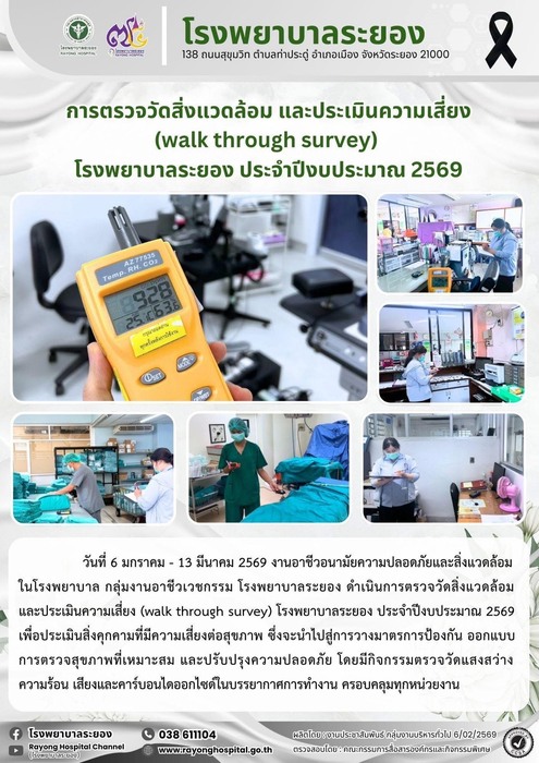 6 ม.ค. 69 - 13 มี.ค. 69 งานอาชีวอนามัย ความปลอดภัยและสิ่งแวดล้อมในโรงพยาบาล กลุ่มงานอาชีวเวชกรรม โรงพยาบาลระยอง ดำเนินการตรวจวัดสิ่งแวดล้อม และประเมินความเสี่ยง (walk through survey) เพื่อประเมินสิ่งคุกคามที่มีความเสี่ยงต่อสุขภาพ