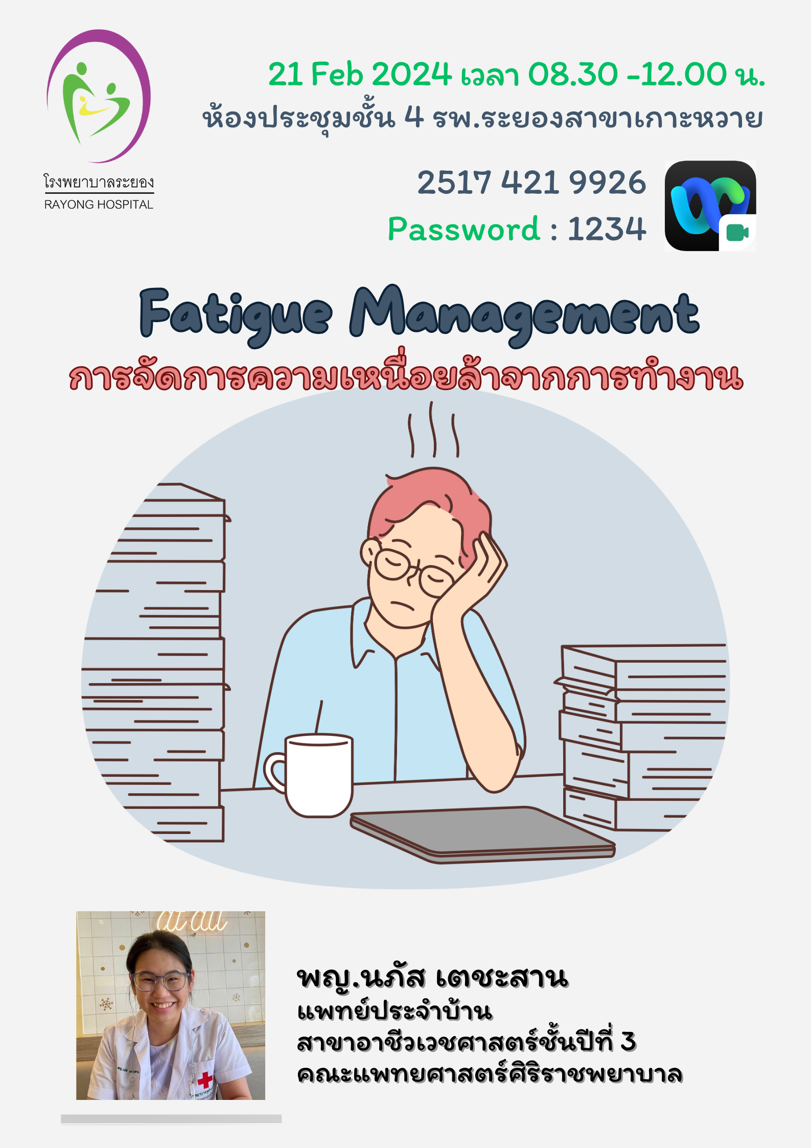 คลิปVDOนำเสนอ Topic การจัดการความเหนื่อยล้าจากการทำงาน วันที่ 21 กพ.67 โดยพญ. นภัส เตชะสาน แพทย์ประจ...