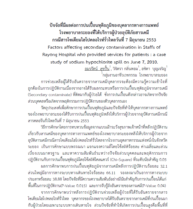 ปัจจัยการปนเปื้อนทุติยภูมิของบุคลากรทางการแพทย์โรงพยาบาลระยองที่ให้บริการผู้ป่วยอุบัติภัยสารเคมี กรณีสารโซเดียมไฮโปคลอไรท์รั่วไหลวันที่ 7 มิถุนายน 2553