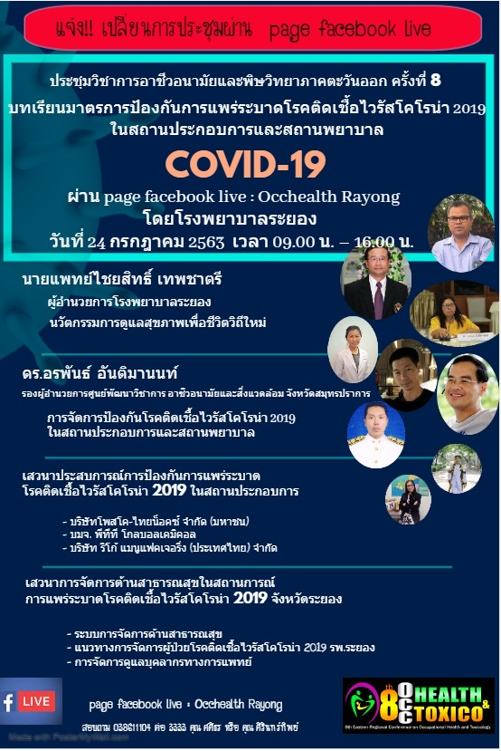 แจ้งเปลี่ยนการประชุมวิชาการอาชีวอนามัยและพิษวิทยาภาคตะวันออก ครั้งที่ 8 ผ่าน Page Facebook Live : Occhealth Rayong