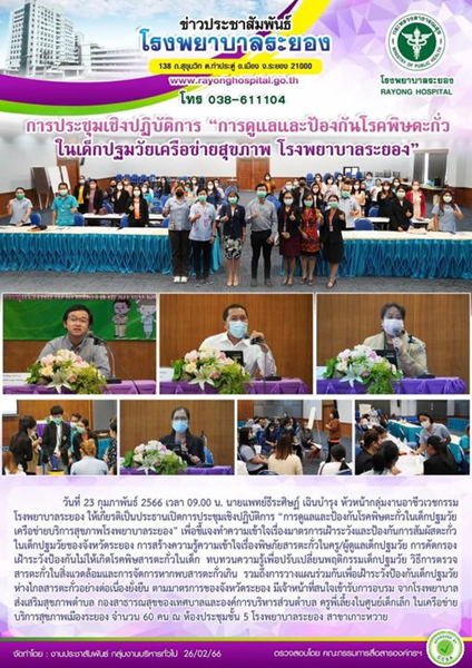 23 ก.พ.65 ประชุมเครือข่ายเฝ้าระวังโรคพิษตะกั่วในเด็กปฐมวัย รพ.ระยอง เพิ่มพูนความรู้และทักษะการจัดระบบเฝ้าระวังสุขภาพ โดยการประเมินความเสี่ยงสภาพแวดล้อมในศูนย์พัฒนาเด็กเล็ก และทำแผนจัดการความเสี่ยงที่พบ เพื่อให้เด็กปลอดภัยจากสารตะกั่ว ได้รับความร่วมมือจากภาคีเครือข่ายทุกภาคส่วน มีการออกแบบระบบงานเพิ่มเติม เช่น การประเมินความเสี่ยงสัมผัสสารตะกั่วบูรณาการพร้อมครูเยี่ยมบ้านเด็ก การสร้างความรอบรู้ ผู้ปกครอง การจัดซื้อเครื่องเล่น อุปกรณ์ตามมาตรฐาน มอก.