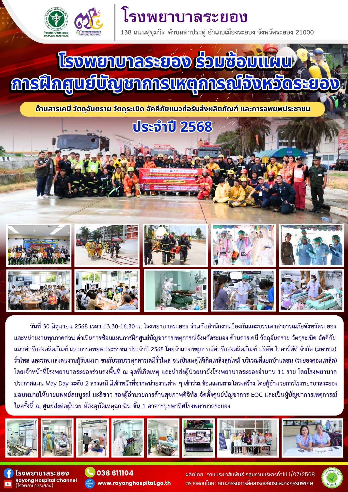 30 มิย 68 เวลา 13.30-16.30 น. ซ้อมแผนรับอุบัติภัยสารเคมีจังหวัดระยอง ระดับ 2 ประจำปีงบประมาณ 2568 โรงพยาบาลระยอง ร่วมกับสำนักงานป้องกันและบรรเทาสาธารณภัยจังหวัดระยอง และหน่วยงานทุกภาคส่วน ดำเนินการซ้อมแผนการฝึกศูนย์บัญชาการจังหวัดระยอง (ด้านสารเคมี วัตถุอันตราย วัตถุระเบิดและอัคคีภัยแนวท่อรับส่งผลิตภัณฑ์ และการอพยพประชาชน) ประจำปี 2568 เหตุท่อรับส่งผลิตภัณฑ์ บริษัท ไออาร์พีซี จำกัด (มหาชน) รั่วไหล และรถขนส่งคนงานผู้รับเหมา ชนกับรถบรรทุกสารเคมีรั่วไหล จนเป็นเหตุให้เกิดเพลิงลุกไหม้ ณ บริเวณสี่แยกบ้านดอน (ระยองคอมเพล็ค) และห้องประชุมเทศบาลตำบลเชิงเนิน และพื้นที่โรงพยาบาลระยอง อำเภอเมืองระยอง จังหวัดระยอง