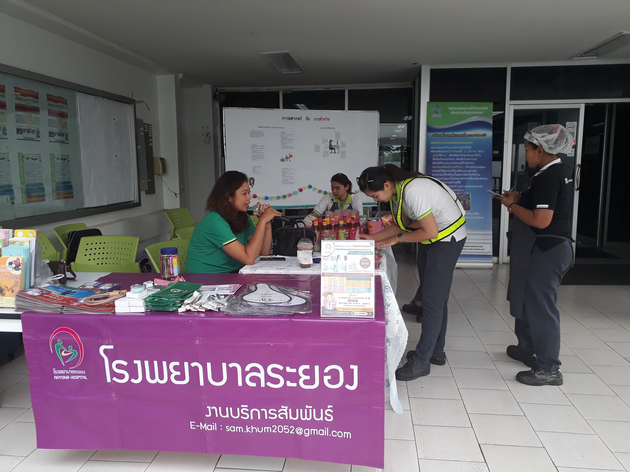 15 กุมภาพันธ์ 2562 จัดบูธกิจกรรมสัปดาห์ด้านความปลอดภัย อาชีวอนามัยและสิ่งแวดล้อม และให้ความรู้ด้านการยศาสตร์และการดูแลสุขภาพเบื้องต้น ณ บริษัท วาลีโอ ออโตโมทิฟ (ประเทศไทย) จำกัด โดยทีมโรงพยาบาลระยอง ประกอบด้วย งานบริการสัมพันธ์ งานกายภาพบำบัด และงานอาชีวเวชกรรม
